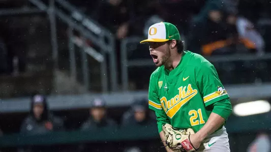 Named a first-team All-American by the National Collegiate Baseball Writers Association … A second-team Collegiate Baseball All-American selection … One of four players to earn Collegiate Baseball Freshmen of the Year honors … Named second-team Freshman All-America by both Perfect game and D1Baseball … A second-team American Baseball Coaches Association (ABCA) all-region selection … Earned first-team All-Pac-12 recognition … A finalist for the NCBWA Stopper of the Year award … Finished with the fourth most saves in Oregon single-season history with 15 … Appeared in 22 games out of the bullpen with a 1.97 ERA and 36 strikeouts and just six walks in 32 innings pitched … Earned a save in half of Oregon’s 30 wins … Did not allow an earned run in his first 13 appearances, while giving up just two unearned runs … at Fresno State (Feb. 20): Earned first career save in first outing on the mound as a Duck, throwing a scoreless ninth inning … vs. Mississippi State (March 5): Picked up first career win in an extra-innings, pitching three innings with a career-high six strikeouts and no walks … vs. Washington (March 24): Pitched two innings to get the save and hold a one-run lead in a series-opening win … vs. Arizona State (April 30): Matched a career-high three innings pitched to earn the save in a 3-2 win … vs. UCLA (May 26): Struck out two in 1.2 innings to lock down the win.