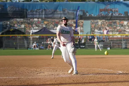 Won 13 games against 7 losses ... Led the Pac-12 in saves with 7, which ranked sixth nationally and tied for second on the UO single-season list ... Had a 2.83 ERA in 128.2 innings ... Appeared in 34 games (eighth in the Pac-12), starting 20 ... Struck out 90 batters while walking 22 ... Ranked third in the Pac-12 in fewest walks per 7.0 innings pitched (1.20) ... Posted complete game wins against five different Pac-12 schools in 2023 - No. 3 UCLA (3-0) Arizona (8-0), No. 7 Stanford (2-1), California (9-1) Arizona State (5-2). Won 11 of her last 15 decisions ... Threw 6.0 strong innings to get her first win as a Duck against Ole Miss (Feb. 11), giving up 3 runs and striking out 5 ... Came on to record the final two outs for the save in the Ducks' 6-4 win at San Diego State (Feb. 18) ... Earned second save of the season by closing out Oregon's 6-4 win against No. 24 Missouri (Feb. 25) ... » Struck out 8 in a 9-0, 5 inning shutout of LMU (Mar. 4) ... Pitched the seventh inning at No. 10 Washington (Mar. 10) to get the save ... Complete game 4-hitter in a 2-1 win against No. 7 Stanford (3/18), where she gave up an unearned run and struck out 4 ... Threw a complete game, two-hit shutout against No. 3 UCLA (Mar. 24) with 4 strikeouts ... Tossed a complete game, one-hit six-inning shutout against Lindenwood (Apr. 6) with 5 Ks ... Tremendous weekend at ASU where she went 1-0 with 2 saves, allowed 1 earned run in 10.0 IP (0.70 ERA) and struck out 11 ... Selected as an NFCA Top Performance of the Week for her efforts against ASU ... Went the distance in a 5-2 win at ASU (Apr. 14) where she struck out a season-high 9 while giving up 2 runs (1 earned) on 4 hits ... Had back-to-back saves the next two games at ASU (Apr. 15-16) ... Threw a 3-hit shutout in an 8-0 win against Arizona (Apr. 21) ... Tossed 4.2 shutout innings in relief to pick up the win versus Arizona (Apr. 23) ... Selected as an NFCA Top Performance of the Week for her efforts against Arizona (2-0, 0,00 ERA, 11 K, 0 BB, 11.2 IP) ... Big weekend at Cal (Apr. 28-30) with 2 wins and a save; didn’t walk a batter in 12.2 innings ... Gave up one run in a complete game, 9-1 win at Cal (4/28) ... Came in with runners on in the sixth inning and closed the door for her sixth save of the season at Cal (Apr. 29) ... Terrific performance at the NCAA Regional where she got a 4-out save against Notre Dame (May 19) and then threw a complete game against No. 13 Arkansas (May 20), striking out six in the win.