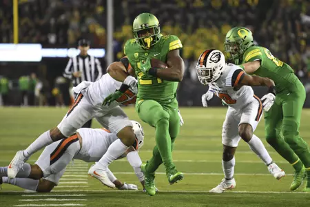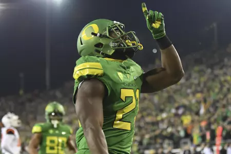 2016 — Finished the season as the team's leading rusher, recording nine touchdowns for 945 rushing yards, despite not playing against Colorado and less than full strength in several others . . . Started at running back in 10 games while adding a 10th score with a 1-yard catch in Salt Lake City . . . Remains only nine rushing touchdowns shy from becoming Oregon's all-time leader in career rushing touchdowns (44) and 936 yards away from equaling the Ducks all-time rushing record (4,146 yards) . . . The honorable mention all-conference standout eclipsed the 100-yard plateau five times, including his last three games of the year vs. Stanford, Utah and Oregon State, with his 22nd career effort over the century mark placing him second in Oregon history . . . Added a second 200-yard performance of his collegiate tenure with 207 yards against Virginia on a season-high 21 carries . . . Ran for three touchdowns at Washington State and scored a pair of TDs on two additional occasions . . . Included was a career-long 85-yard score in the second game of the year against Virginia . . . Only the fourth player in Oregon history to rush for more than 1,000 yards in back-to-back seasons (2014, 2015).