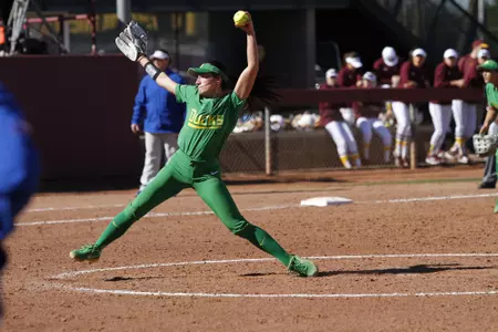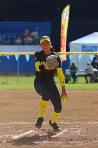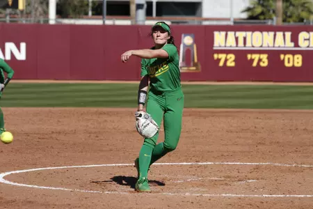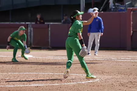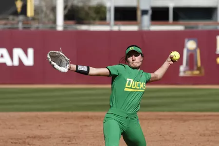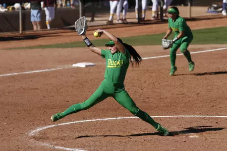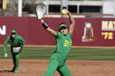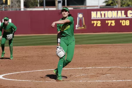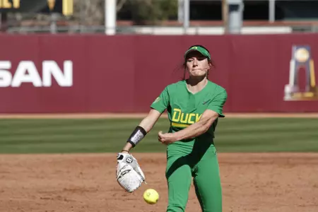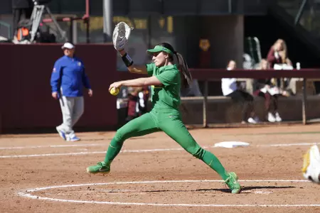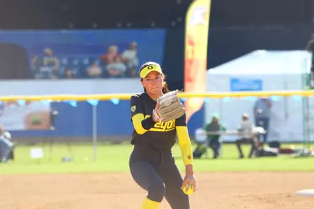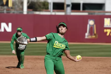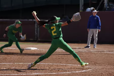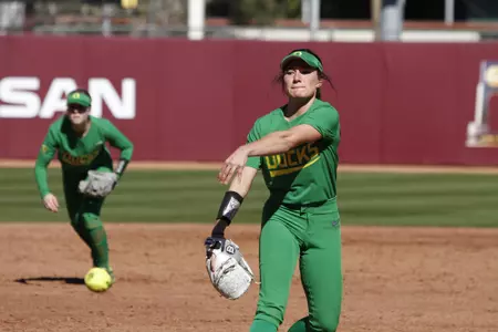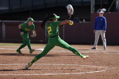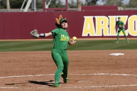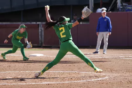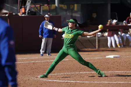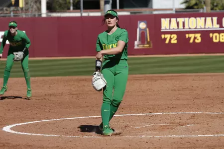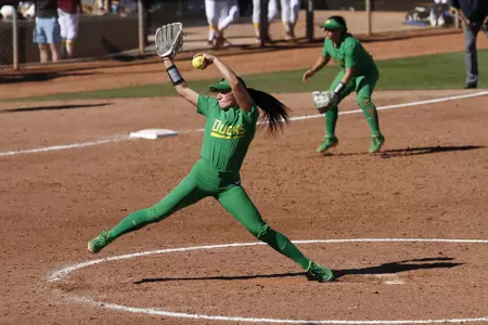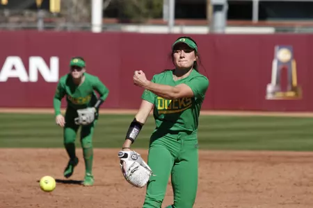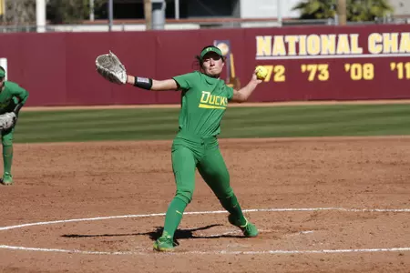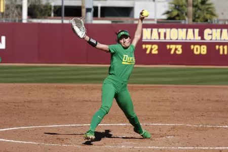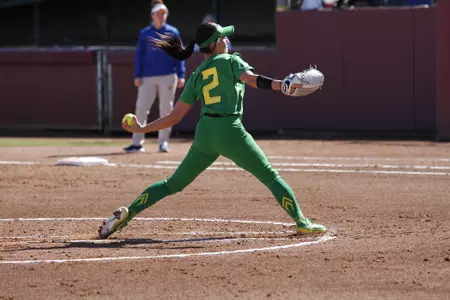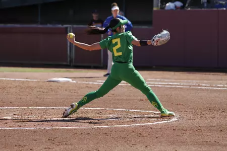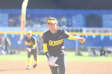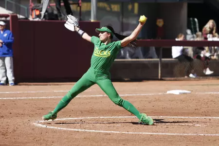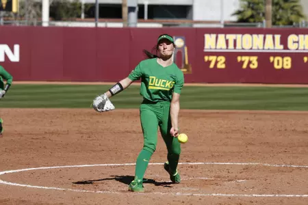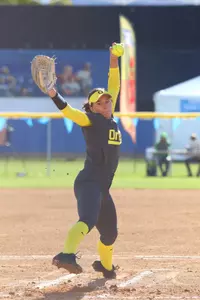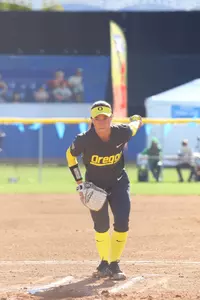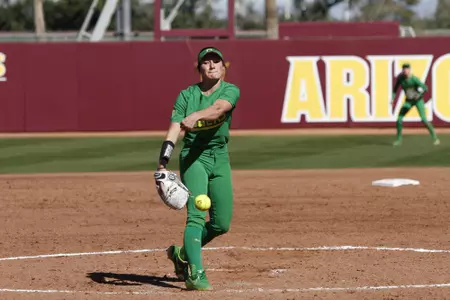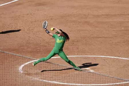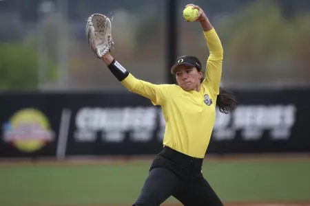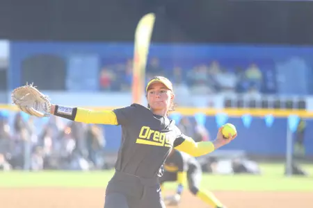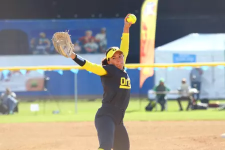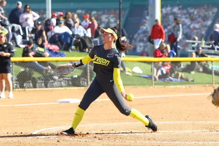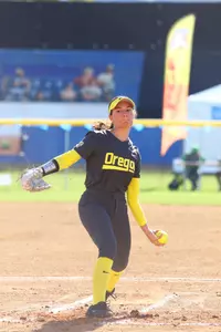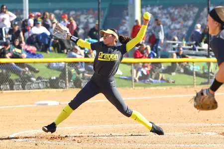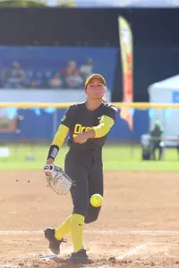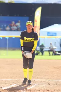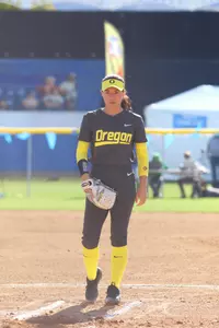 An absolute workhorse for the Ducks as the only scholarship pitcher the circle, compiling an 18-18 record with a 4.12 ERA in a whopping 248.0 innings pitched over 45 appearances (39 starts) ... Two-time Pac-12 Pitcher of the Week ... Threw no-hitters against Florida Atlantic (Feb. 16) and Pacific (March 27), becoming just the fourth Duck ever to throw multiple seven-inning no-hitters in one season ... Led the Pac-12 by more than 70.0 innings pitched and ranked second in the nation during the regular season ... 248.0 innings ranks eighth in UO single-season history, the most by a Duck since 2014 ... Third in program history in games started and tied for fifth in appearances ... Second in the Pac-12 and 17th in the NCAA during the regular season with a career-high 240 strikeouts, the sixth-most in UO single-season history ... Second in the Pac-12 with 60 batters struck out looking ... Fifth in the Pac-12 with 18 wins in the regular season ... Tossed 23 complete games and five shutouts ... Started the season 9-0 with a 2.33 ERA and 74 strikeouts through first 12 appearances (nine starts) ... Started Oregon's final 17 games … vs. LSU (Feb. 15): Earned the win over the No. 8 Tigers, striking out eight in a complete-game effort ... vs. FAU (Feb. 16): Fired first career no-hitter, striking out nine over seven complete innings ... vs. Florida (Feb. 28): Took a tough loss despite a brilliant performance against the No. 3 Gators at the Judi Garman Classic, striking out six without allowing an earned run over six stellar innings ... at Pacific (March 27): Tossed second no-hitter of the season, racking up a career-high 13 strikeouts to lead Oregon to a 5-0 win ... Mizzou Touranment (April 6-7): Named the Pac-12 Pitcher of the Week for the first time (April 8) after going 3-0 with three complete games in a span of 24 hours, allowing just five runs with 23 strikeouts over 19.0 innings ... at UCLA (April 12): Absolutely stellar in leading the Ducks to a 4-3 upset win over the No. 1 Bruins, striking out 12 while allowing only three runs in seven full innings ... vs. California (April 18-20): Earned second Pac-12 Pitcher of the Week award (April 22) after holding Cal scoreless with 22 strikeouts over 20.2 innings, including back-to-back complete-game shutouts in games one and two.