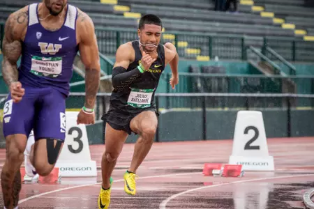2017-18: Outdoor - Helped his team take second place to score eight points for Oregon in the 4x100 meter relay (39.41) at the PAC-12 Championships ... Also competed in the 100 meter preliminaries (10.57w) at the PAC-12 Championships ... Recorded a personal best in both the 100 meters (10.52) and the 200 meters (21.46) at the Desert Heat Classic ... Also helped his team take first place and move into the number two spot all-time at Oregon in the 4x100 meter relay (39.05) at the Desert Heat Classic ... Competed in the 100 meters (10.61) at the Mt. Sac Relays Collegiate Open ... Helped his team take fourth place in the 4x100 meter relay (39.54) at the Mt. Sac Relays Elite Invitational ... Competed in the 100 meters (10.52w) and the 200 meters (21.5w) at the Pepsi Invitational ... Helped his team take first place in the 4x100 meter relay (39.94) and recorded a new personal record in the 100 meters (10.57) at the Aztec Invitational. Indoor - Competed in the 60 meter preliminaries at the MPSF Championships ... Ran in the 60 meter preliminaries at the Don Kirby Elite Invitational ... Competed in the 60 meters (6.94) and the 200 meters (22.43) at the UW Indoor Preview.